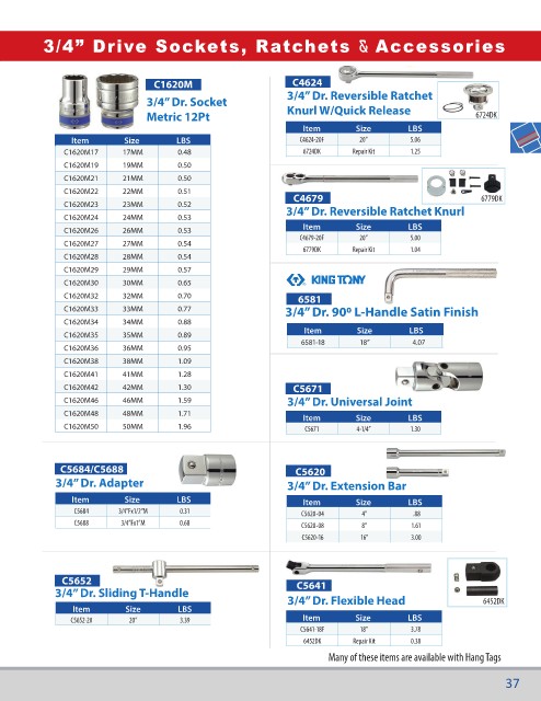3/4” Dr. Socket 3/4” Dr. Reversible Ratchet