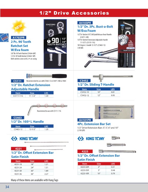 Item Size LBS $ 1/2” Drive Extension Bars 3”, 5”, 6” and 10”