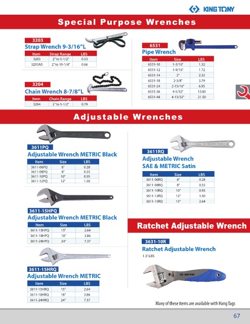 Item Size LBS $ Adjustable Wrench