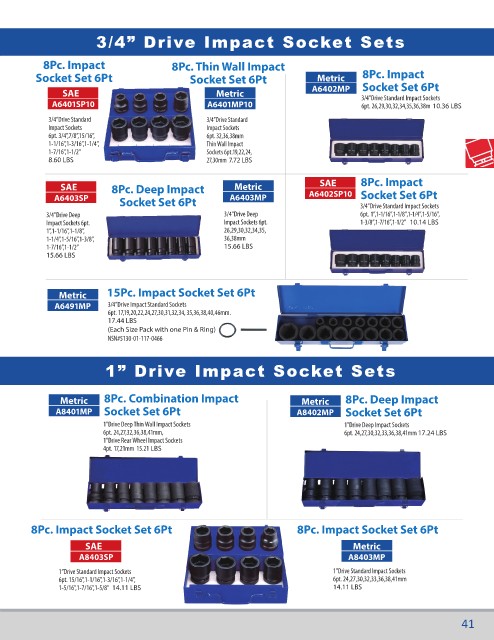 SAE Metric A6402MP 3/4”Drive Standard Impact Sockets